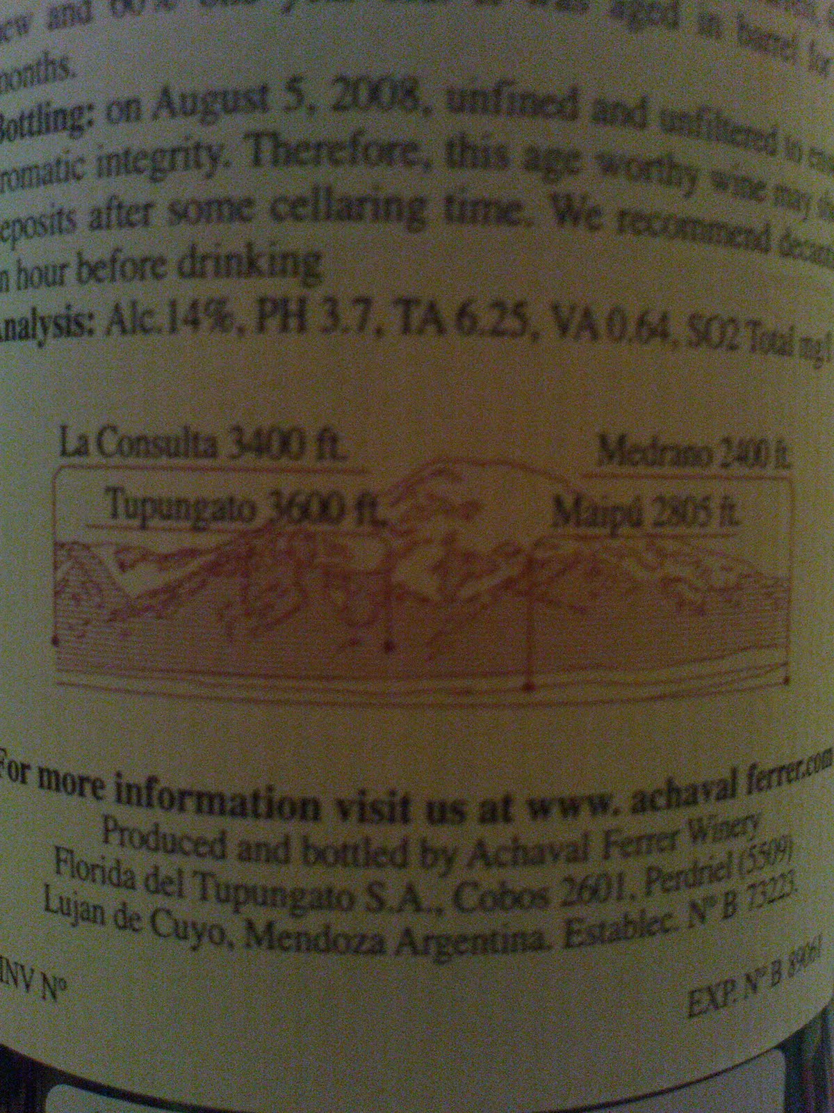 This wine is 100% Malbec. The grapes for this wine come from the La Consulta vinyard in San Carlos, Mendoza. The grapes are grown at an altitude of 990 meters above sea level and the vineyard is located at a latitude of 33º49’134’’ South. The age of the vineyard is 57 years. The row orientation is North to South. The trellis system used is low espalier. The vines are planted at a density of 5000 vines per hectare. The yield was 2600 kg per hectare. Furrow irrigation was used and the vines are planted on their own roots. The vineyard soil is alluvial, sandy soil with pebbles throughout.