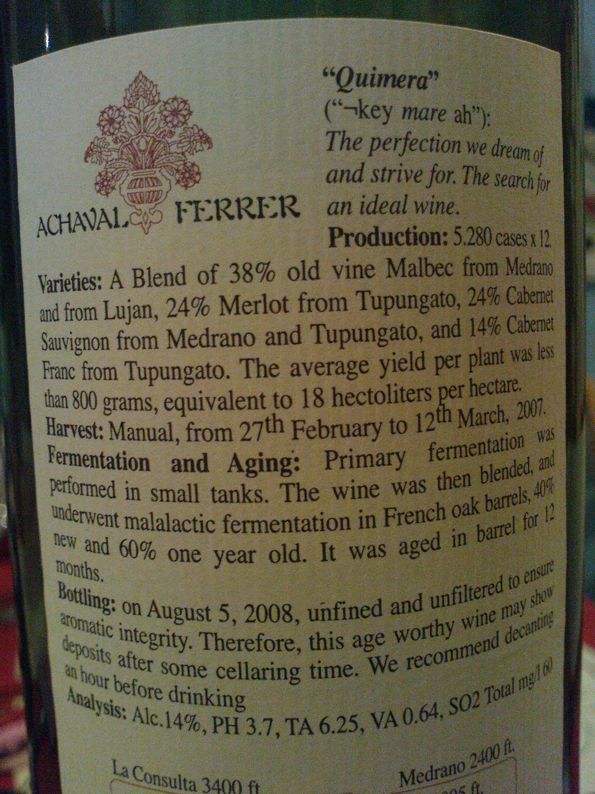 "Quimera" is pronounced "key mare ah". 5,280 twelve bottle cases were produced. The wine is a blend of 38% Malbec from Medrano and from Lujan, 24% Merlot from Tupungato, 24% Cabernet Sauvignon from Medrano and Tupungato, and 14% Cabernet Franc from Tupungato. The average yield per plant was less than 800 grammes which is equivalent to 18 hectolitres per hectare. The grapes were harvested between 27th Ferubary to the 12th March 2007.